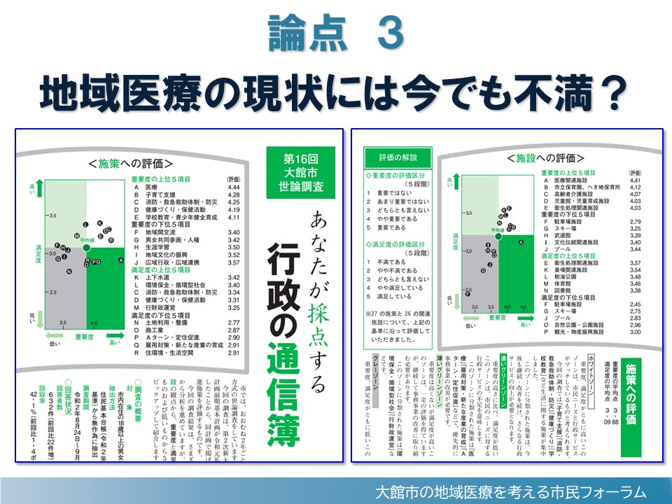 医療に対する重要度と満足度の乖離が続く現状については、さらに市民の意識調査やニーズ分析などの社会調査を実施するなど、満足度を高める施策を実施すべきと考えます。
