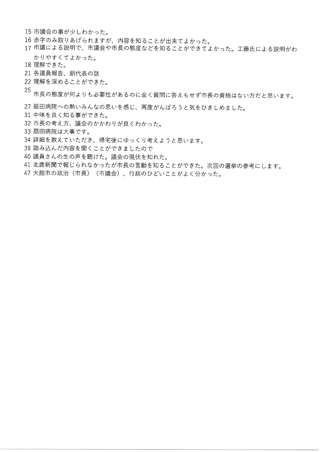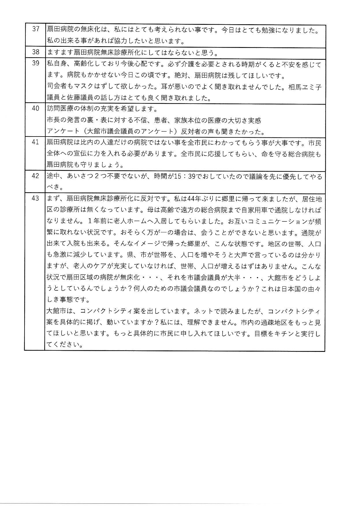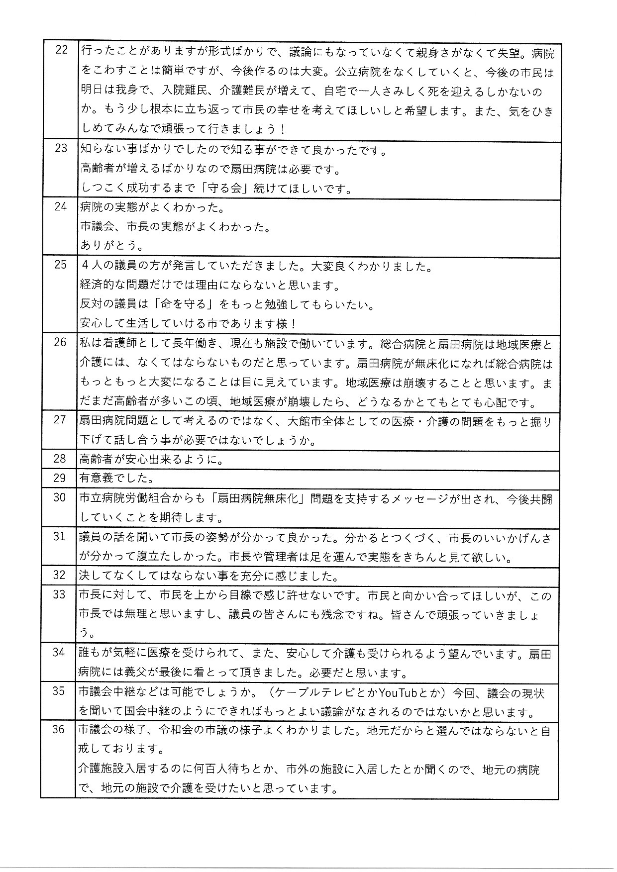 うち,病院事業関連の質問者は半数の7名で、扇田病院の無床診療所化問題に関する質問を行ったのは、6名。この問題について「市民の代表」である市会議員も注目している、ということがよくわかりました。
