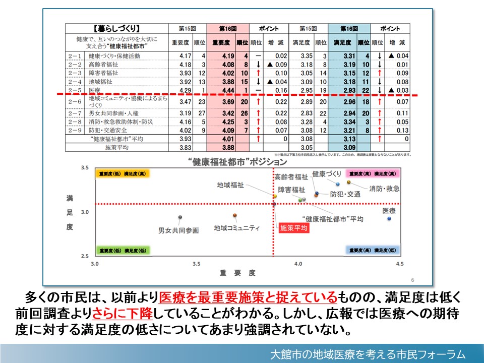 医療に対する重要度と満足度の乖離が続く現状については、さらに市民の意識調査やニーズ分析などの社会調査を実施するなど、満足度を高める施策を実施すべきと考えます。