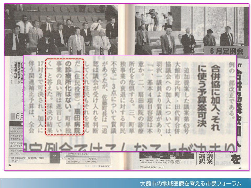 市長答弁 「医療と介護の連携で住み慣れた地域で暮らし続けるためには、地域包括ケアの実現が不可欠。そのためにはまず比内地域に医療機関を残すことと医療・介護が連携していくことが最重要と考えた。これについては県医師会の小玉会長とも意見交換しており、『政争の具にはしないことが肝要』とのご意見も頂いている」